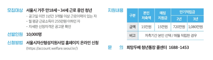 그런데 서울시에서 "희망두배 청년통장" 이라는 이름으로, 청년들이 목돈을 마련할 수