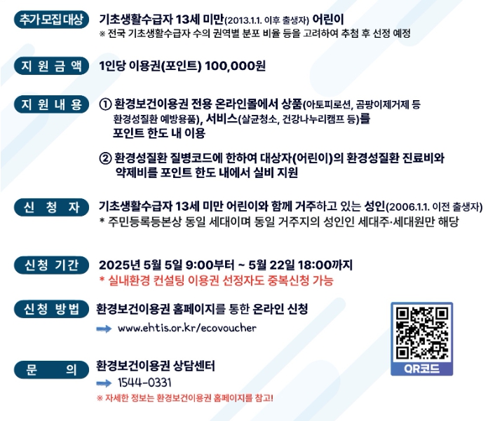 - 전화 신청: 환경보건이용권 콜센터 1544-0331 (평일 09:00 ~ 18:00, 점심시간 12:00 ~ 13:00)